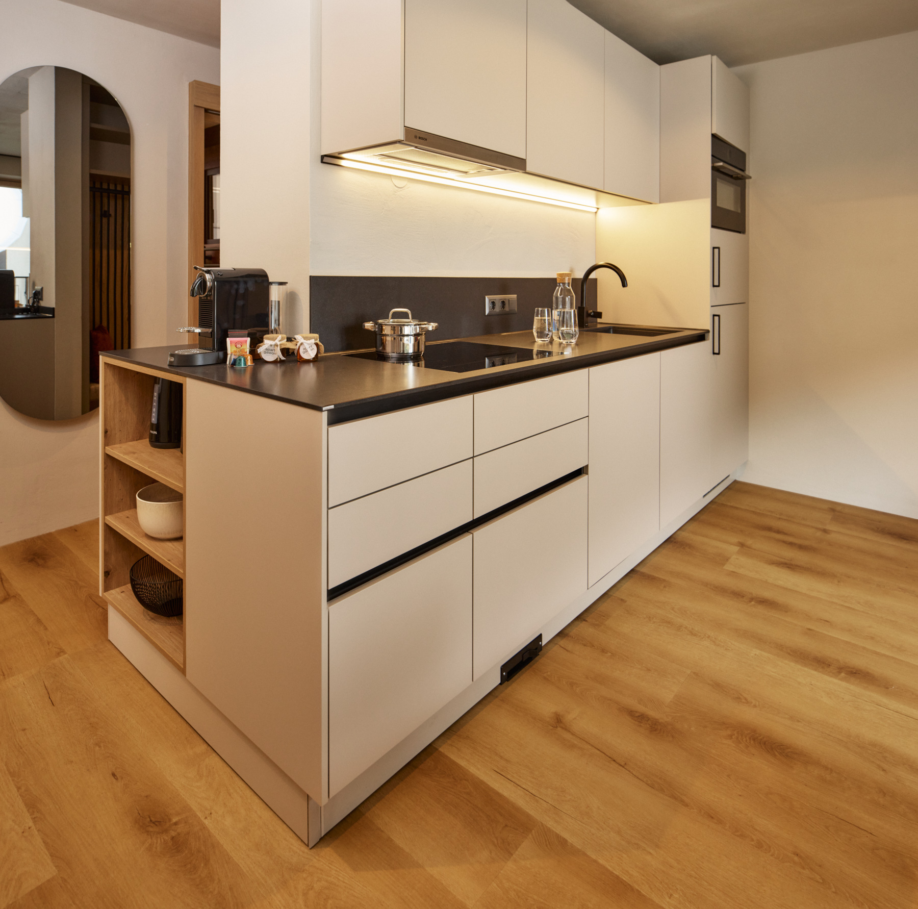 Fully equipped kitchen with fridge and freezer, oven, dishwasher, microwave, hob, coffee machine and kettle